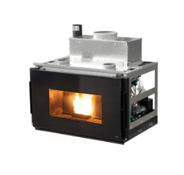 Cheminée Insert à pellets au format panoramique, canalisable. Brasero et foyer en fonte noire. Gestion intelligente de la combustion par la technologie Maestro avec double Wi-Fi inclus.