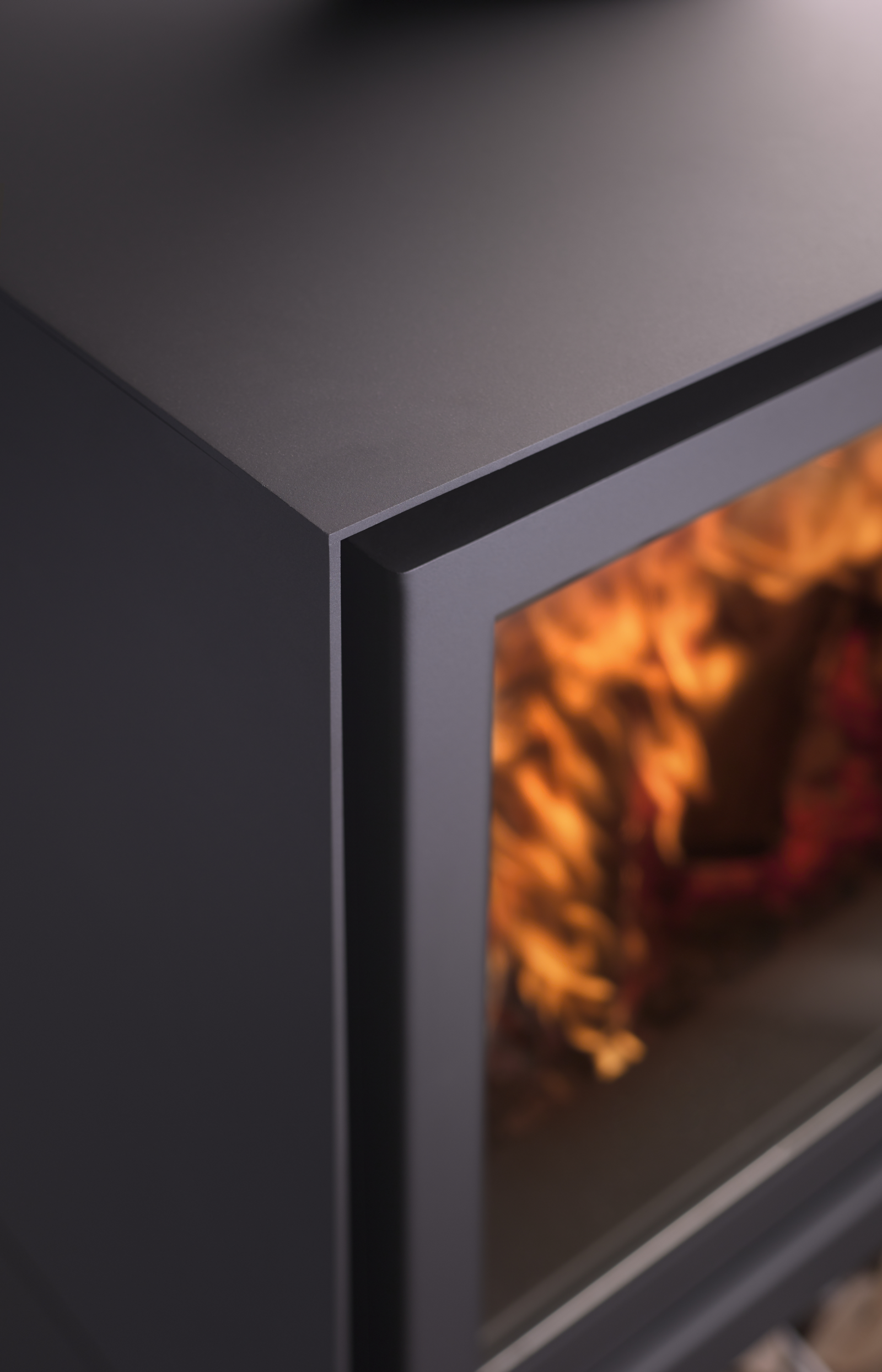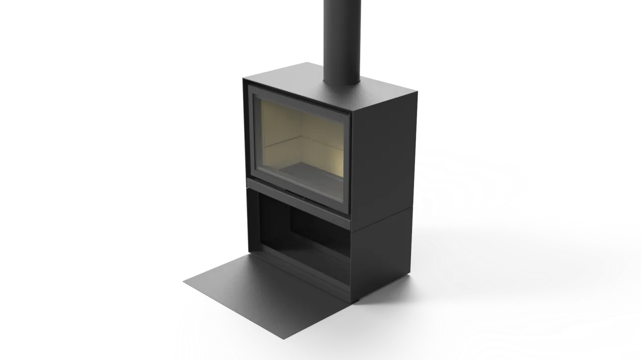 Avec son design épuré et sa réserve de bûches intégrée, le Stûv 16-H existe en trois largeurs et peut être livré avec socle de protection.